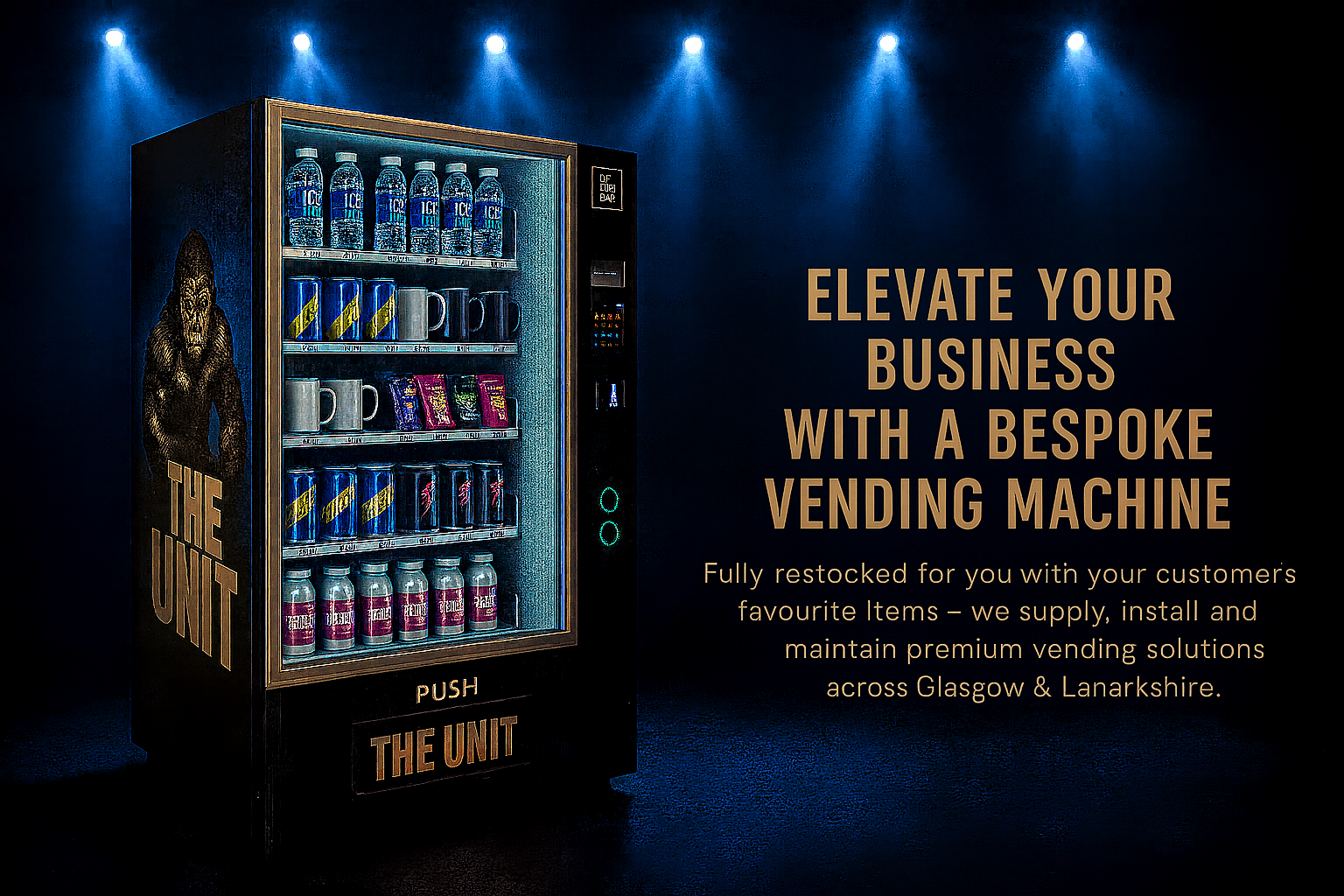 A vending machine filled with bottled water, snacks, and beverages, with a dark background and blue lighting, next to text reading: "Elevate your business with a bespoke vending machine. Fully stocked for your customers with supply, installation, and maintenance across Glasgow and Lanarkshire."
